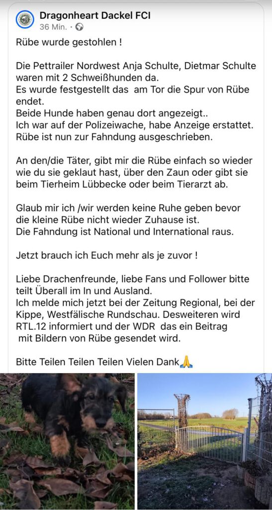 Der kleine Dackelwelpe Rübe wurde aus dem Garten gestohlen. Wer etwas dazu weiß oder Rübe gesehen hat, meldet sich bitte an dieser Telefonnummer.